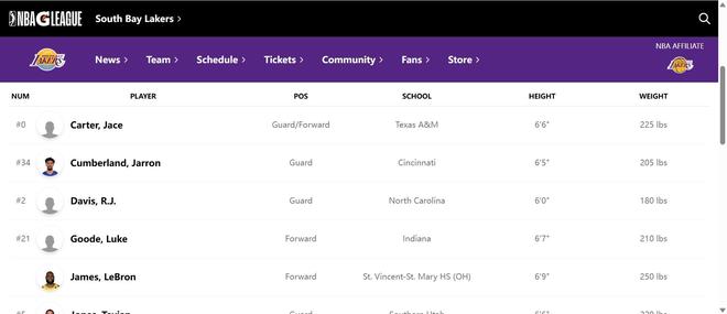 正式“在编”G联赛球员,詹姆斯出现在了南湾湖人的阵容名单中